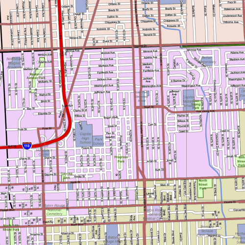 Download an editable vector map of Baton Rouge, LA in AI format. Includes streets, zip codes, and local neighborhoods across 17 smart layers.