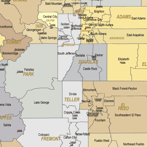 - Colorado Subdivision Map – Based on U.S. Census divisions such as towns, communities, or CCDs (Census County Divisions).