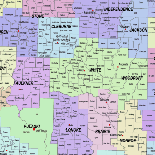 Arkansas County and Communities Map showcases cities, districts, villages, boroughs, barrios, and townships. Instant download file.