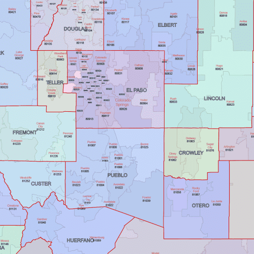 CO ZIP Code Map With Cities Counties created using U.S. Census data, it displays only standard ZIP Codes with geographic extents.