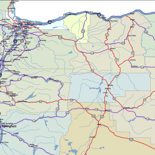 Oregon Road and City Map displays a wide range of features, including major roads, cities, and larger settlements. Rivers, lakes. AI, PDF.