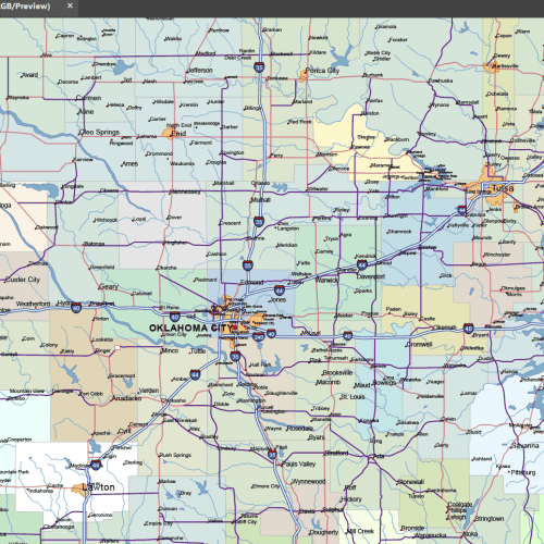 Oklahoma Road and City Map displays a wide range of features, including major roads, cities, and larger settlements. Rivers, lakes. AI, PDF