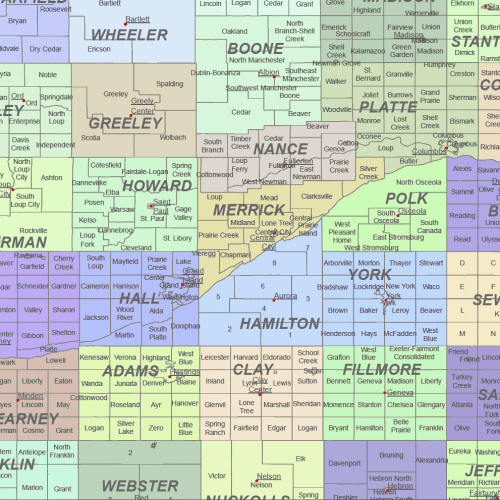 The Nebraska County and Communities Map showcases cities, districts, villages, boroughs, barrios, and townships. Instant download file.