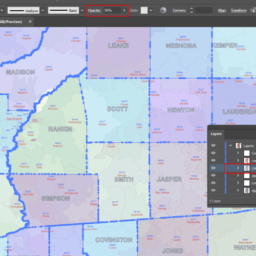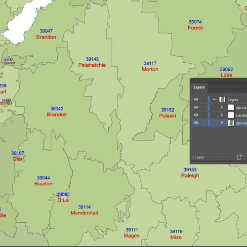 MS ZIP Code Map With Cities Counties Editable files in AI and PDF formats make for planning, logistics, analysis, or detailed presentations.