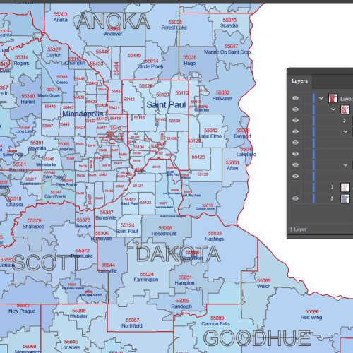 MN ZIP Code Map With Cities Counties Suitable for further editing for graphics and marketing purposes